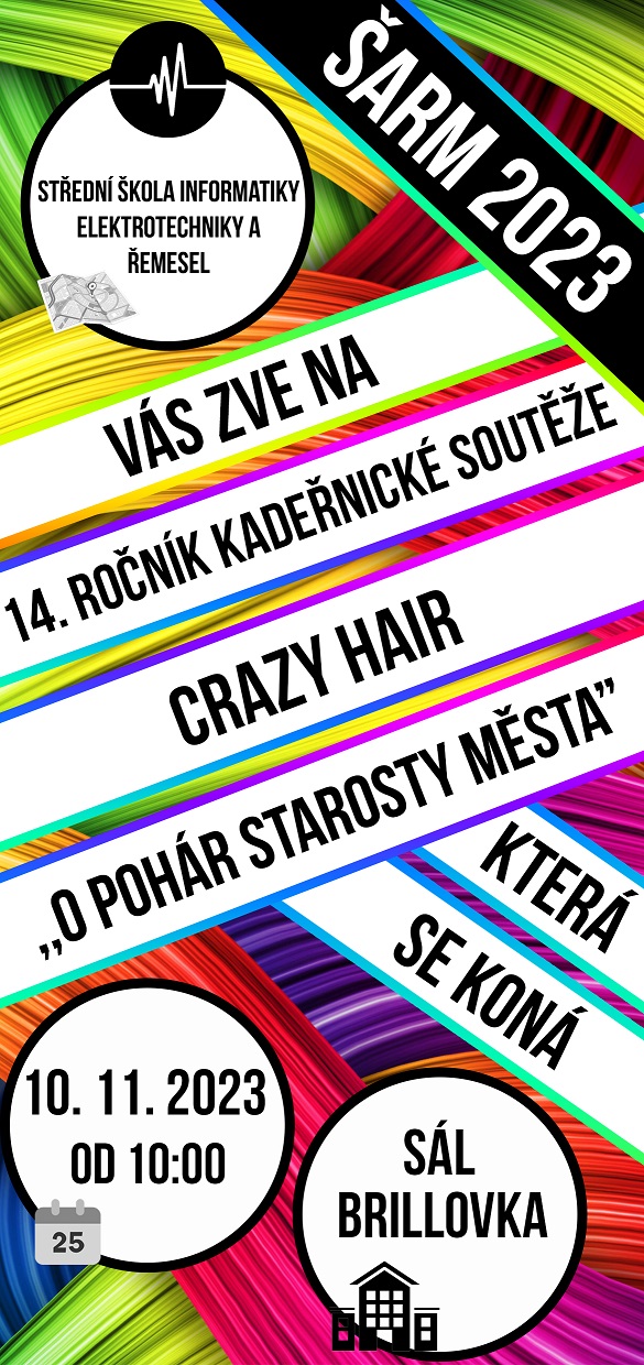V pátek 10. 11. 2023 proběhne již 14. ročník kadeřnické soutěže ŠARM. V jeho rámci předvedou kadeřnice 3. ročníků svou zručnost i kreativitu. Tématem pro letošní rok je CRAZY HAIR.