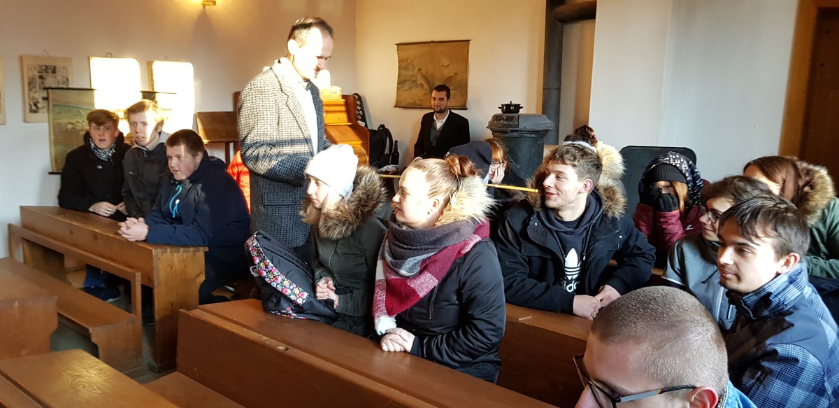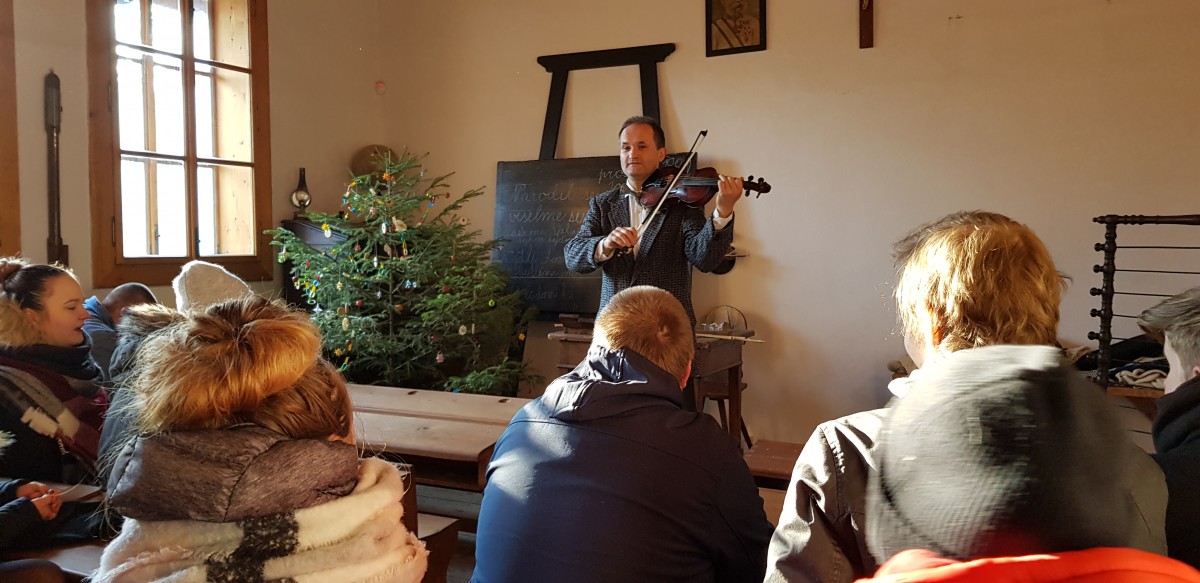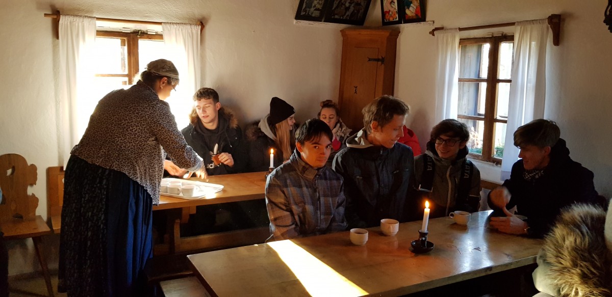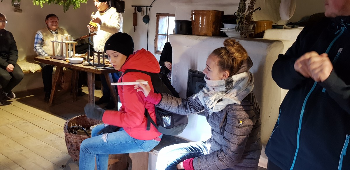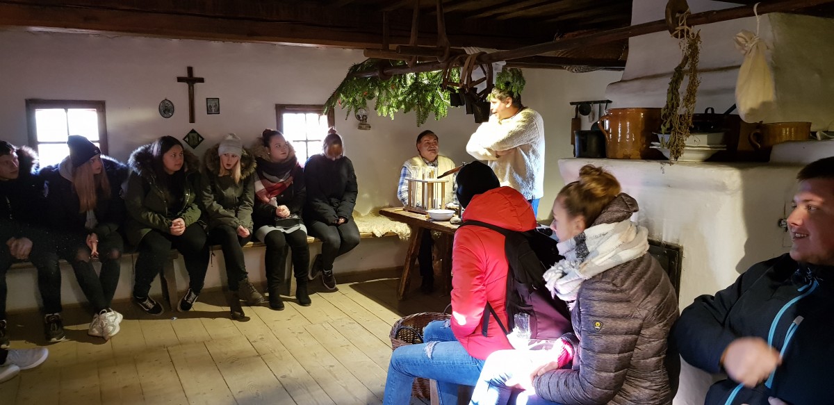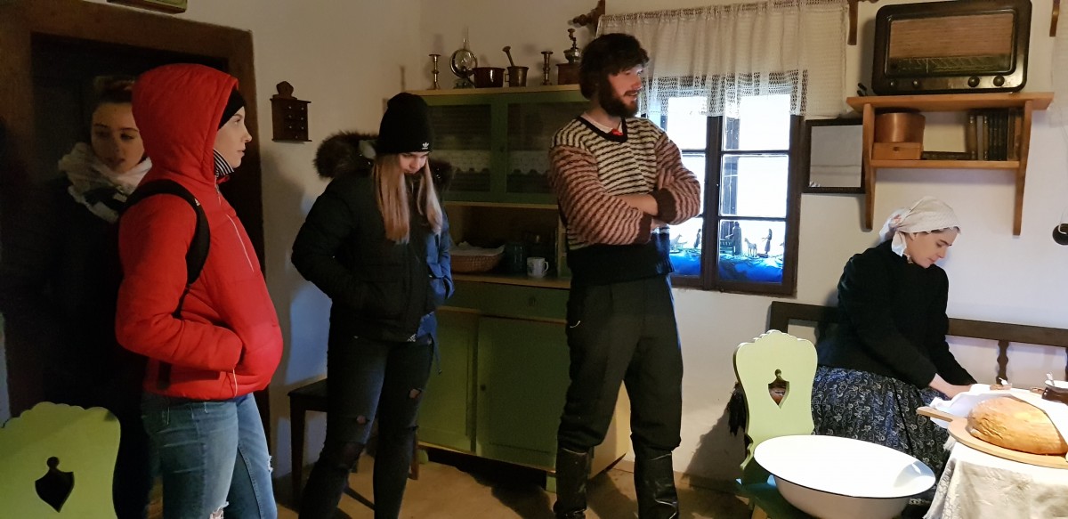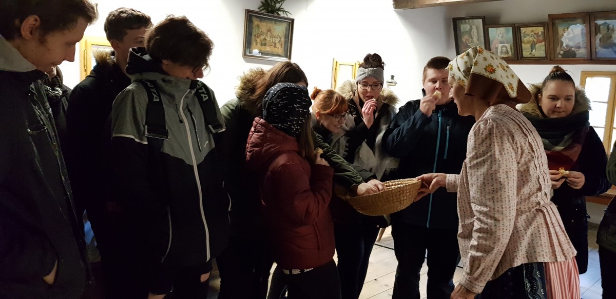 Pak následovala ukázková hodiny ve valašské škole. To se třídní divila, jak všichni seděli, ruce za zády a ani nedýchali. Možná to bylo rákoskou v ruce pana učitele (proč se zajímala, kde se dá rákoska pořídit, nikdo z žáků nechápal). Po učení následovalo povídání o tom, jak se v chalupách svítilo a jak Valaši vyráběli svíce - ty lojové nám fakt nevoněly. A v poslední dřevěnici na nás čekaly hospodyně s čajem a perníkem. V dědině jsme potkali i Mikuláše s čerty a za krátkou koledu jsem dostali křížaly z jablek, které se urodily přímo na stráni.