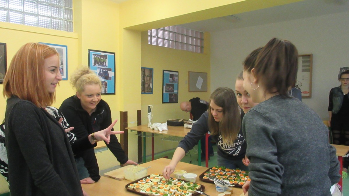 Z prvního patra se prakticky po celý den šířila velmi příjemná vůně, protože v těchto prostorách měli žáci (především žákyně) možnost vyzkoušet si pod vedením Mgr. Labajové a Mgr. Pernické přípravu zdravých svačinek. Výsledkem jejich snažení bylo několik druhů pomazánek, které se podávaly na celozrnném pečivu. Sborovna se proměnila v improvizované kuchyňské studio, které ovládla absolventka naší školy Zdenka Babincová, dnes zaměstnankyně firmy Mandragora. Ta žákům představila pro ně neznámé druhy zdravých surovin a připravila z nich za asistence některých děvčat jednoduchá jídla.