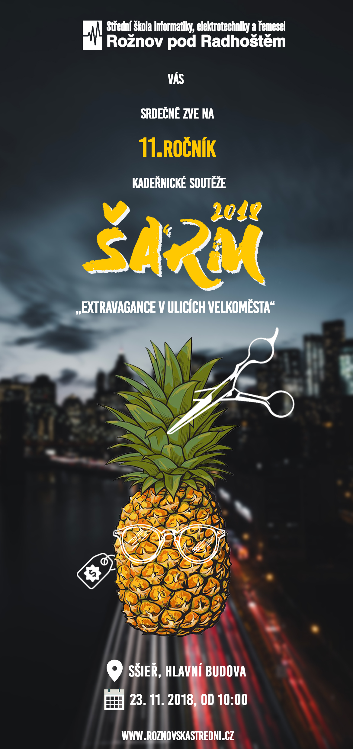 Srdečně vás zveme na 11.ročník kadeřnické soutěže ŠARM, která proběhne v pátek 23. 11. 2018 od 10.00, na hlavní budově SŠIEŘ v Rožnově pod Radhoštěm a akce se koná v rámci dne otevřených dveří.