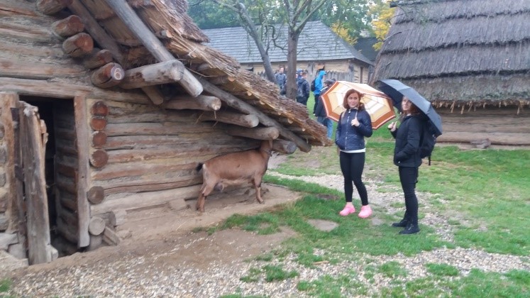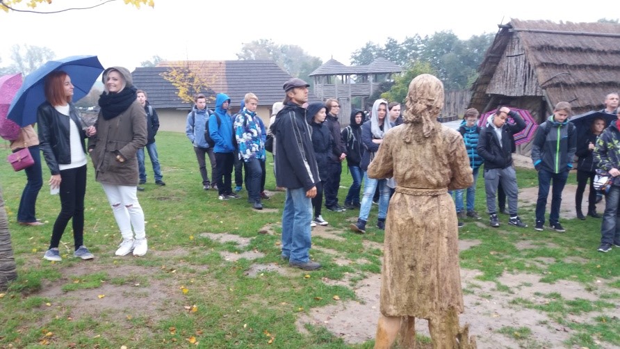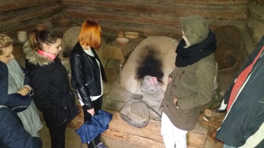 Archeoskanzen je totiž věrnou replikou slovanského opevněného sídliště, která byla vybudována na místě skutečné historické lokality mezi Velehradem a Uherským Hradištěm. Prvním seznámením s místem, kde v 9. století žili naši předci, byl výstup na strážní věž, odkud se nám otevřel výhled na celou vesnici. Pak jsme postupně procházeli velmi skromné příbytky, které byly vystavěny jako napodobeniny skutečných obydlí rekonstruovaných na základě nálezů archeologických vykopávek. Zvláště žáci vyšších postav měli nemalé problémy pohybovat se v polozemnicích, mnozí se do nich jen s obtížemi dostávali. Vzhledem k počasí, které bylo poměrně chladné, jsme si mohli dokonale představit, jak náročné bylo v té době přežít zimu vzhledem k „tepelně izolačním“ vlastnostem staveb. Některými stěnami jsme totiž docela slušně mohli sledovat, co se děje venku.