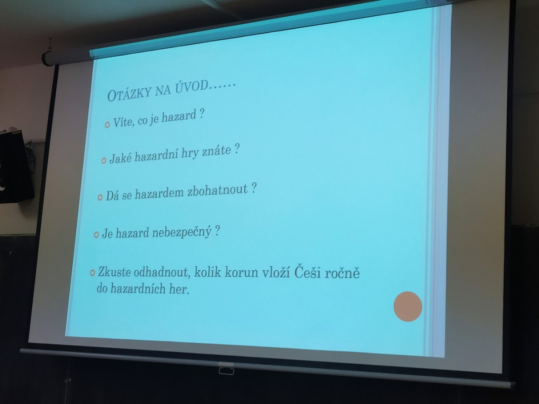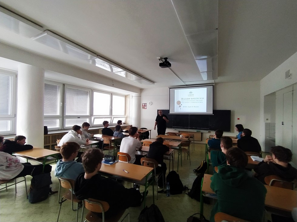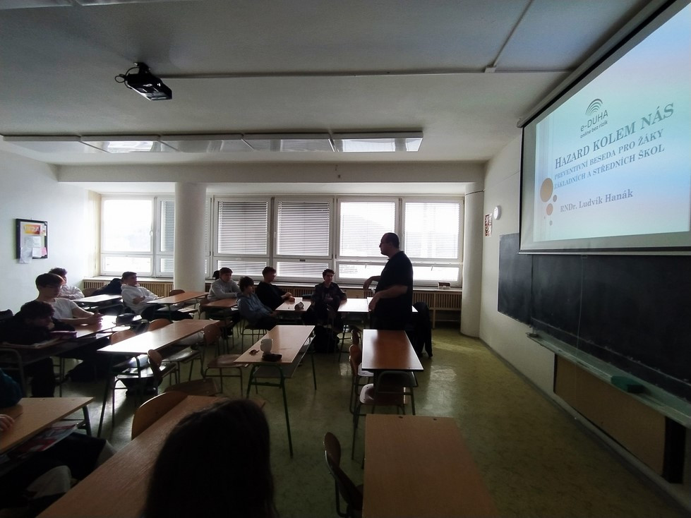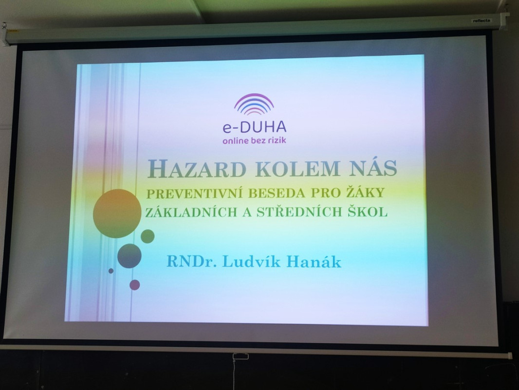 Výukové programy organizace e-Duha (www.e-duha.cz) odrážejí naléhavá témata dnešního světa a zaměřují se především na tvz. nelátkové závislosti a rizika používání informačních technologií. Preventivní program Hazard kolem nás je věnován stále aktuálnější tematice hazardu, gamblingu, hraní a sázení i závislému chování. Míra problémového hráčství narůstá, a jeho dopad na sociální a ekonomické vztahy společnosti je významný, proto je třeba mu věnovat náležitou pozornost. Besedy vedené RNDr. Ludvíkem Hanákem přinesly nejen osobní životní příběh člověka, který těmto závislostem propadl, ale i množství alarmujících informací. V šesti dvouhodinových přednáškách upozornil na nebezpečí a nástrahy, která mohou žáky v online světě i běžném životě potkat.Svůj výklad doplňoval konkrétními životními příběhy a prezentací. Zazněla rovněž řada doporučení na co si dát pozor a jak zbytečně neriskovat.