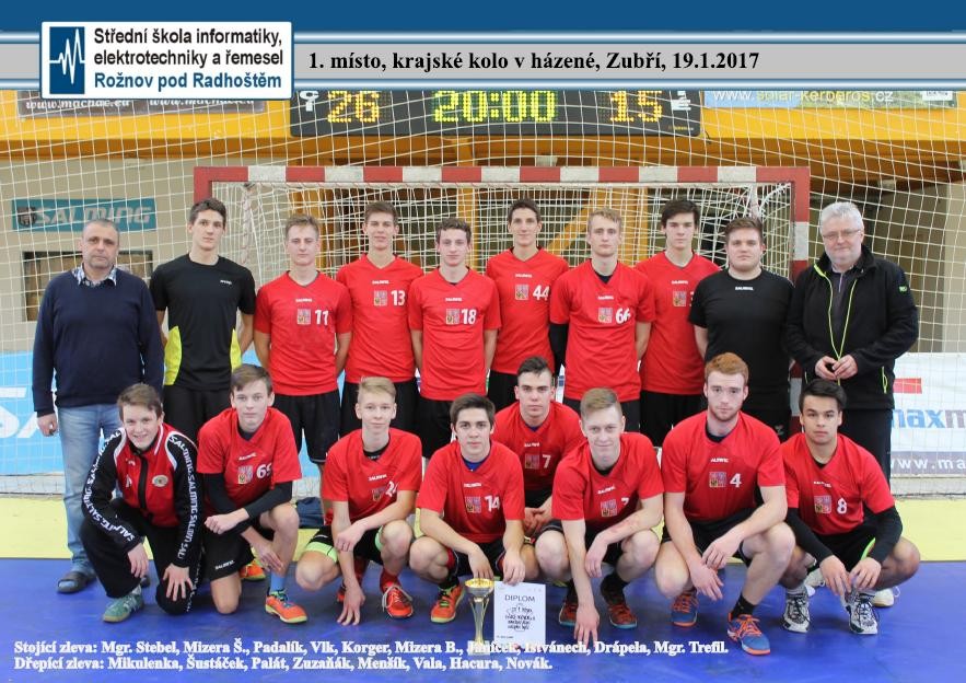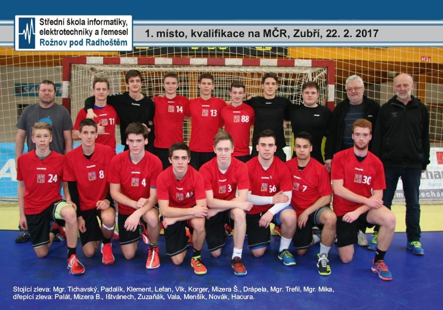 Po vítězství v krajském kole SŠ v házené chlapců (Zubří, 19. 1. 2017), kde jsme porazili Gymnázium Rožnov p/R a OA Valašské Meziříčí následovalo vítězství v kvalifikaci (Zubří, 22. 2. 2017), kde jsme porazili vítěze Olomouckého kraje Střední průmyslovou školu strojnickou Lutín 43:20 (vítěz Moravskoslezského kraje z Karviné nepřijel).