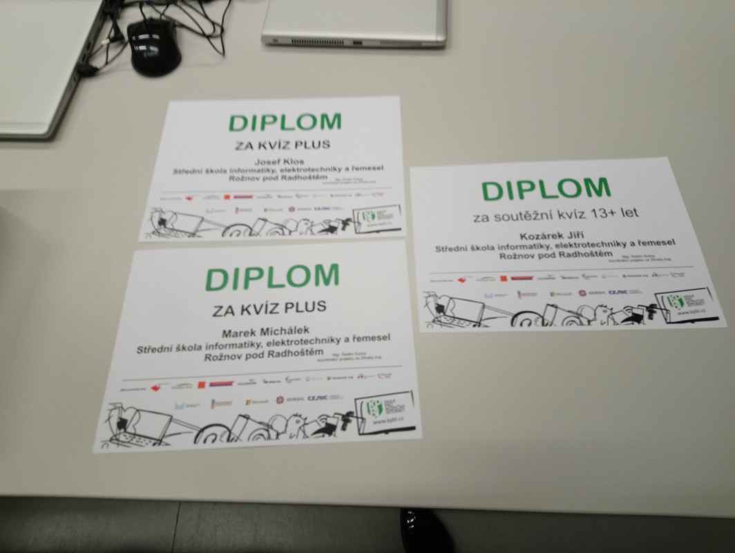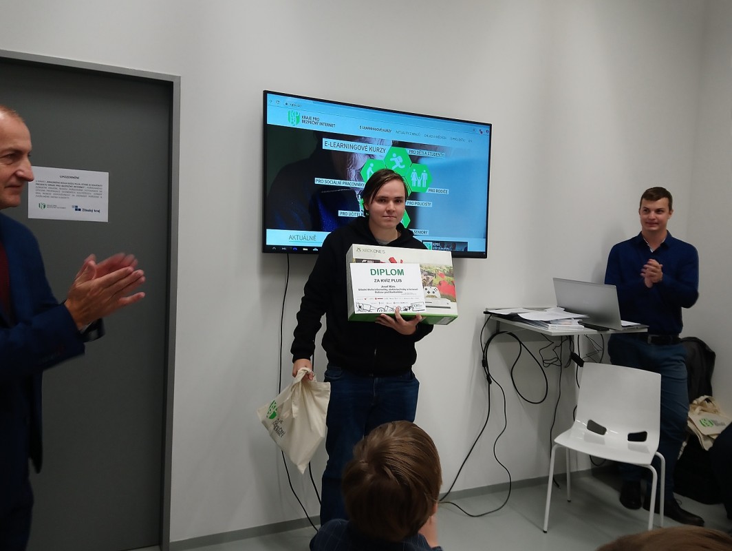 Naši školu reprezentovali Josef Klos (PO1), Marek Michálek (IT1C) a Jiří Kozárek (IT1B). První dva jmenovaní přijeli soutěžit v další, náročnější části Kvízu – Plus. V bleskové internetové bitvě, kdy záleželo nejen na správnosti odpovědí, ale také na rychlosti, zvítězil Josef Klos a postoupil do celostátního finále. Marek Michálek obsadil 4. místo. Třetí žák, Jiří Kozárek, byl vyhodnocen jako úspěšný řešitel základní části Kvízu, který absolvoval již ve škole.