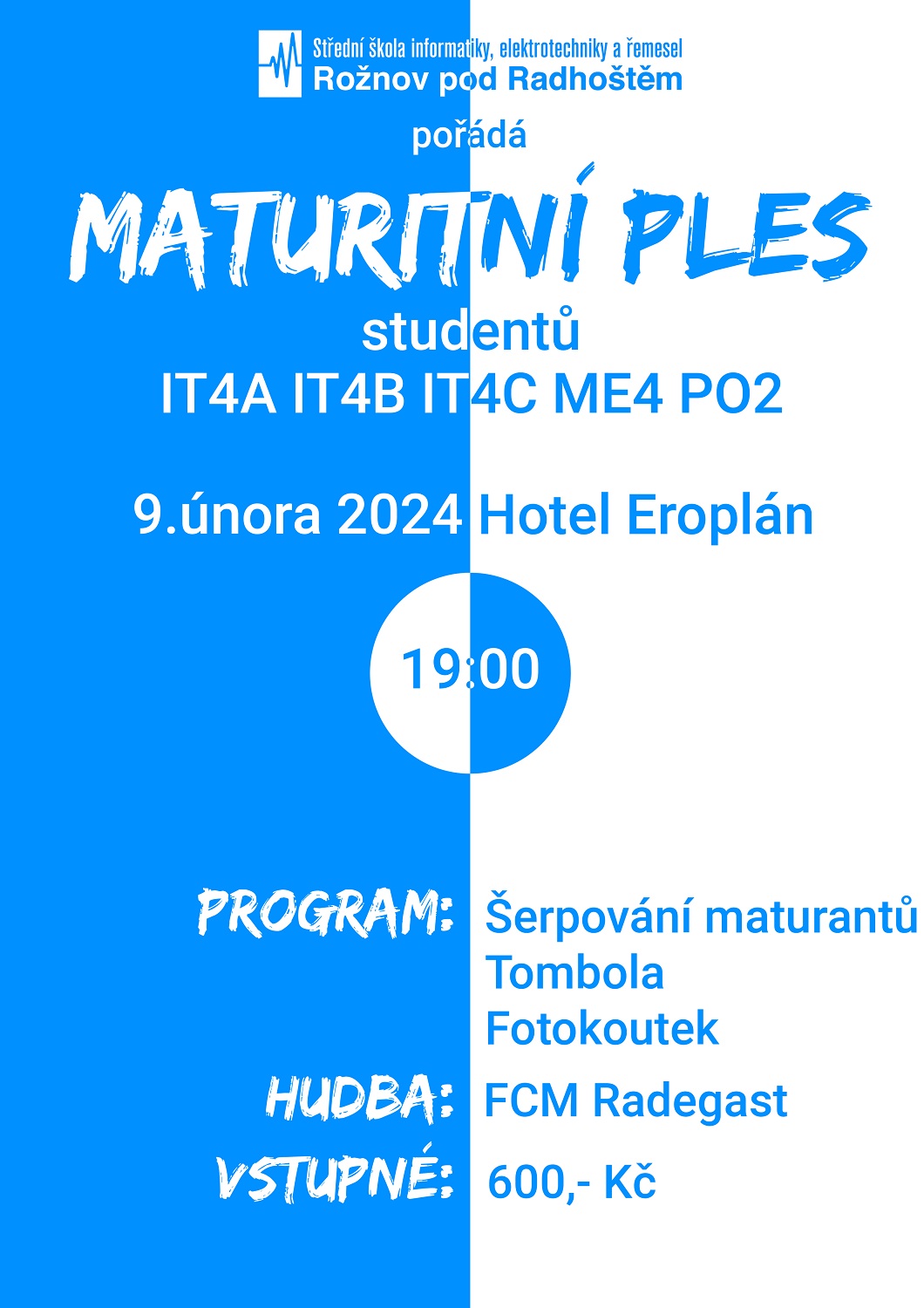 V pátek dne 9. února 2024 od 19:00 hodin proběhne ve všech prostorách hotelu Eroplán maturitní ples SŠIEŘ Rožnov pod Radhoštěm.