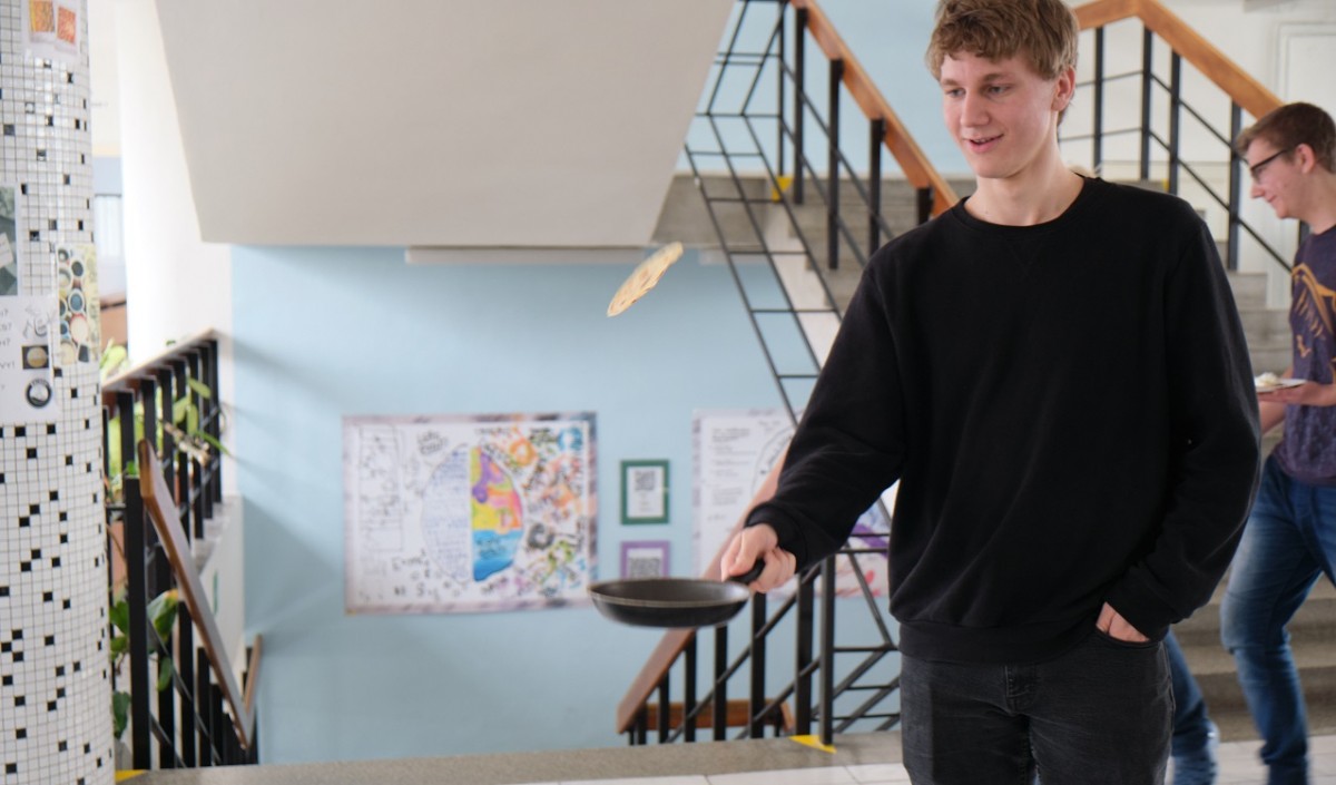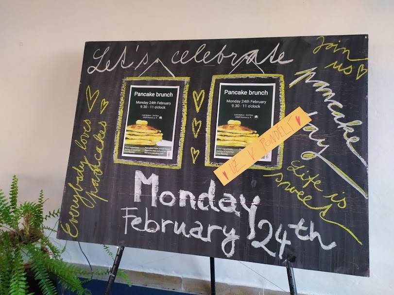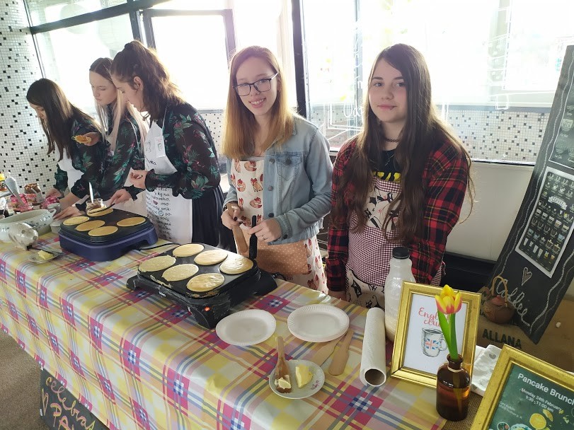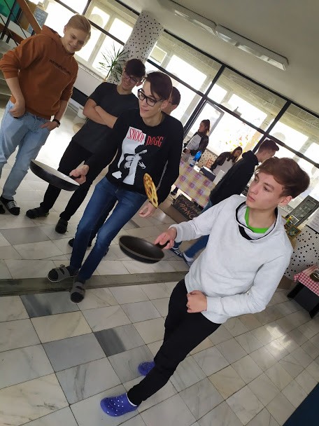 It was a great day at school today! We were celebrating Shrove Tuesday. We spent our English lesson in our school café. There were some girls preparing pancakes. First of all, we were sitting at the table and tasting different jams on toast. We got three points to rate the samples, then. Strawberry jam was the best one for me. After tasting, we tried pancake flipping. And finally, the girls gave us two pancakes. We could choose two toppings. Well, I chose strawberry and raspberry topping. We were served black English tea and milk with it. It was a real laugh!!