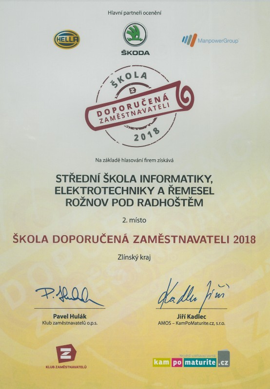 SŠIEŘ Rožnov – 2. místo v kraji v hodnocení firem