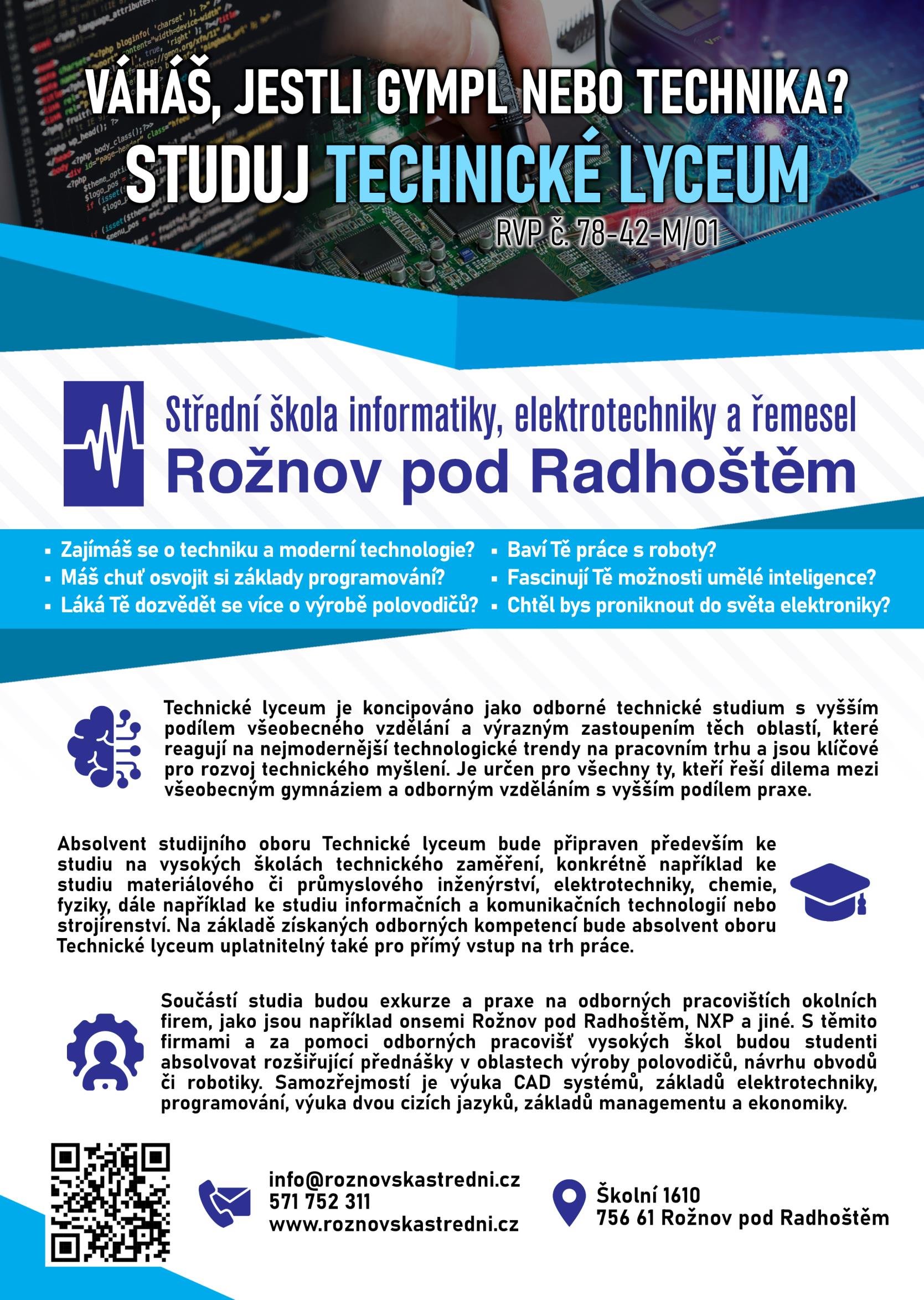 Technické lyceum je koncipováno jako odborné technické studium s vyšším podílem všeobecného vzdělání a výrazným zastoupením těch oblastí, které reagují na nejmodernější technologické trendy na pracovním trhu a jsou klíčové pro rozvoj technického myšlení. Je určen pro všechny ty, kteří řeší dilema mezi všeobecným gymnáziem a odborným vzděláním s vyšším podílem praxe.